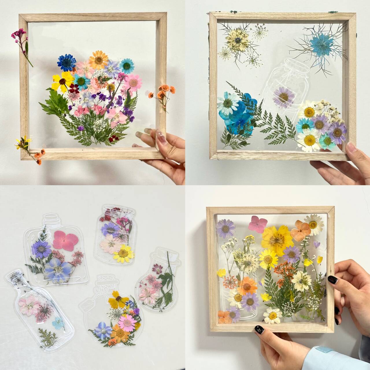 伴随着舒缓的音乐,同学们开始各自着手挑选花叶材料,构筑属于自己的作品。压好的干花非常脆弱,要用镊子小心夹取,虽然镊子数量有限,但大家都很体贴,尽快挑选完材料后就将镊子递给需要的同学。同学们跟随指导教师,充分发挥自己的想象力和创造力,认真构思布局,全神贯注地拼凑、黏合,仿佛将生活的琐碎与烦恼一并融入其中,成品一点点跃然于纸上。枯萎并不是一束鲜花唯一的归宿,每一场相遇都是有意义的,在这个过程中,大家敞开心扉,借花抒怀,讲述自己的故事,并依次介绍自己的作品,相互赠与,分享喜悦。