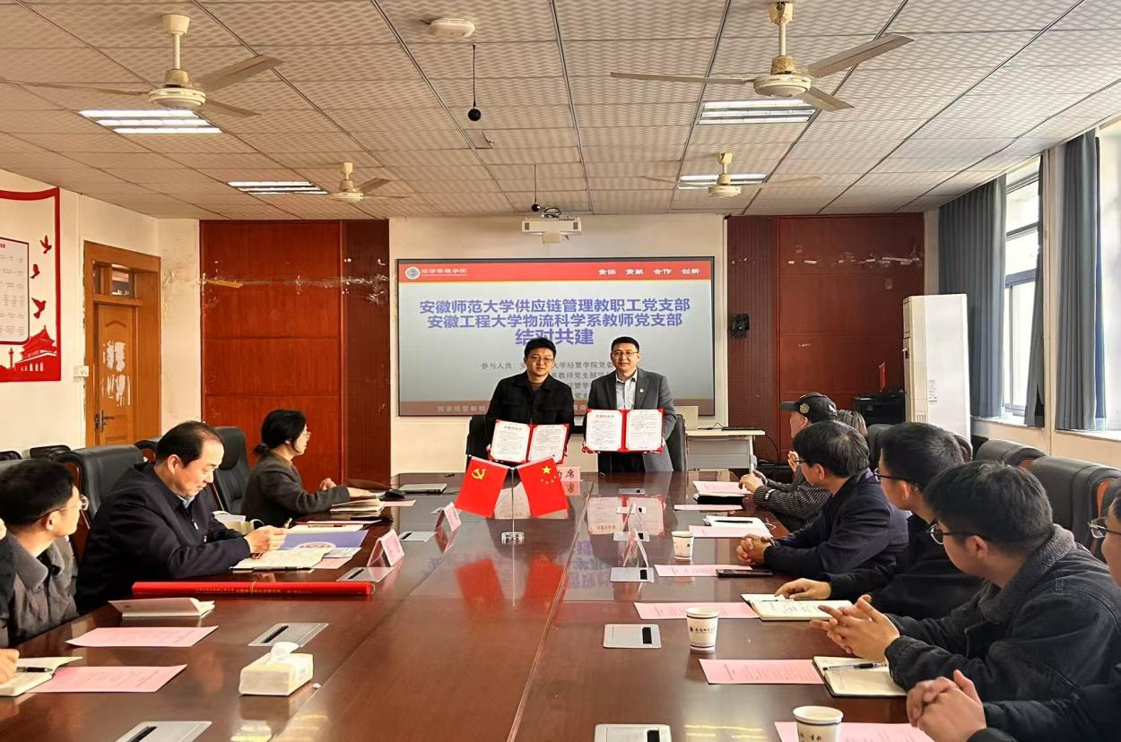 在座谈交流环节,物流科学系教师党支部书记程永宏与安徽师范大学供应链管理教工党支部书记方昶分别介绍了各自党支部在组织建设、人才培养、学生就业等方面的实践成果。双方一致认为,通过结对共建进一步携手推进专业建设与党建工作的同频共振、双向融合,开创党建与专业建设高质量发展新局面,取得新成效。程永宏和方昶代表双方党支部签署了共建协议,并互换协议书,正式确立两校教师党支部长期合作关系。未来,双方将依托支部共建平台,开展党建联学联建、教学研讨、课题合作等多维度交流,共同推动人才培养模式改革,助力毕业生高质量就业。
