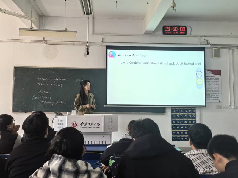 许文清讲授内容为《大学英语(4)》第五单元,围绕Never Judge by Appearances主题,通过知识、能力、价值三维度课程目标展开。她以时下网络热点话题哪吒2在国外媒体引发的相关评论导入,通过对人物外在形象与内在品质的对比引发思考,同时融入了语言知识的讲解和分析,如对相关词汇表达的回顾、提问与词源探究,对文本的赏析等,学生在讨论与反思中让课程主题得到升华,起到了价值传递的课程思政育人效果。教学设计层层递进,帮助学生学习了相关词汇表达,锻炼了其阅读能力与思辨能力,实现了如何正确辨析善与恶的价值观引领。教学过程注重与学生互动,课堂氛围与学生反馈良好。