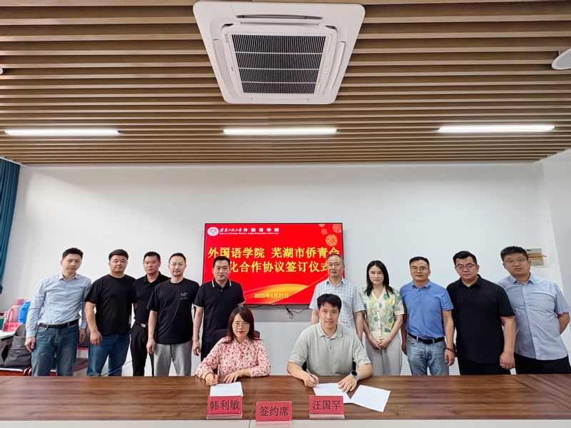 本网讯 5月27日,外国语学院与芜湖市侨联青年委员会签署深化合作协议暨新文科人才实践能力培养横向项目签约仪式在学院211会议室举行。芜湖市侨联党组书记、主席李东方,副主席孙茹,芜湖市侨青会会长、安徽东汇储运股份有限公司总经理汪国罕,副会长兼秘书长、安徽恩瑞医疗总经理汤瑞,副会长、安徽奈思教育投资管理有限公司总经理郑锐,副会长、芜湖同泰智能物流园有限公司总经理张腾,副会长、深圳道瑞轮胎有限公司执行董事易昊,外国语学院党委书记董金权,副院长李新国、韩利敏等共同出席活动。