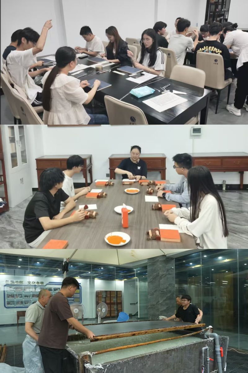 沉浸体验:指尖触摸千年技艺的温度。带着课堂上的思考,同学们旋即投身于线装古籍制作的传统工艺现场。在专业师傅的悉心指导下,大家亲手体验了古法造纸的关键环节——“捞纸”,感受纸浆在竹帘上均匀凝结成宣纸的神奇;在墨香萦绕的工坊里,尝试雕版印刷,体会方寸之间力透纸背的匠心;专注于线装书“穿线”环节,屏息凝神地穿针引线,完成一本线装书的“筋骨”装订。每一次指尖的触碰,都是与跨越千年的工匠对话,古籍不再仅是静态展品,其承载的文化密码与民族智慧在亲手实践中变得鲜活可感。