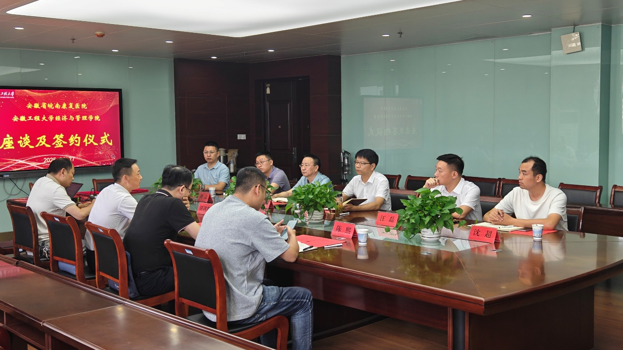 本网讯 6月27日,经济与管理学院与安徽省皖南康复医院合作签约仪式在学院C座818会议室举行。安徽省皖南康复医院党委委员、副院长胡剑辉,相关科室负责人,经济与管理学院党委书记水心宝,院长龚本刚,学院相关老师参加了签约仪式。仪式由数字经济与产业发展研究所所长汪磊主持。