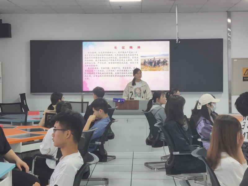 马群同学以“重温长征岁月,传颂革命精神”为主题,饱含深情的为同学们描绘了党在万里长征中的故事。马群以“什么是长征精神”为问题,引导同学们更加深刻、透彻的理解长征精神。她认为长征精神,是中国共产党人和人民军队革命风范的生动反映,是中华民族自强不息的民族品格的集中展示,是以爱国主义为核心的民族精神的最高体现。对红军长征故事,马群同学如数家珍,让同学们仿佛身临那个赤色坚韧的年代,结束的视频片段也激起了同学们高涨的热情。
