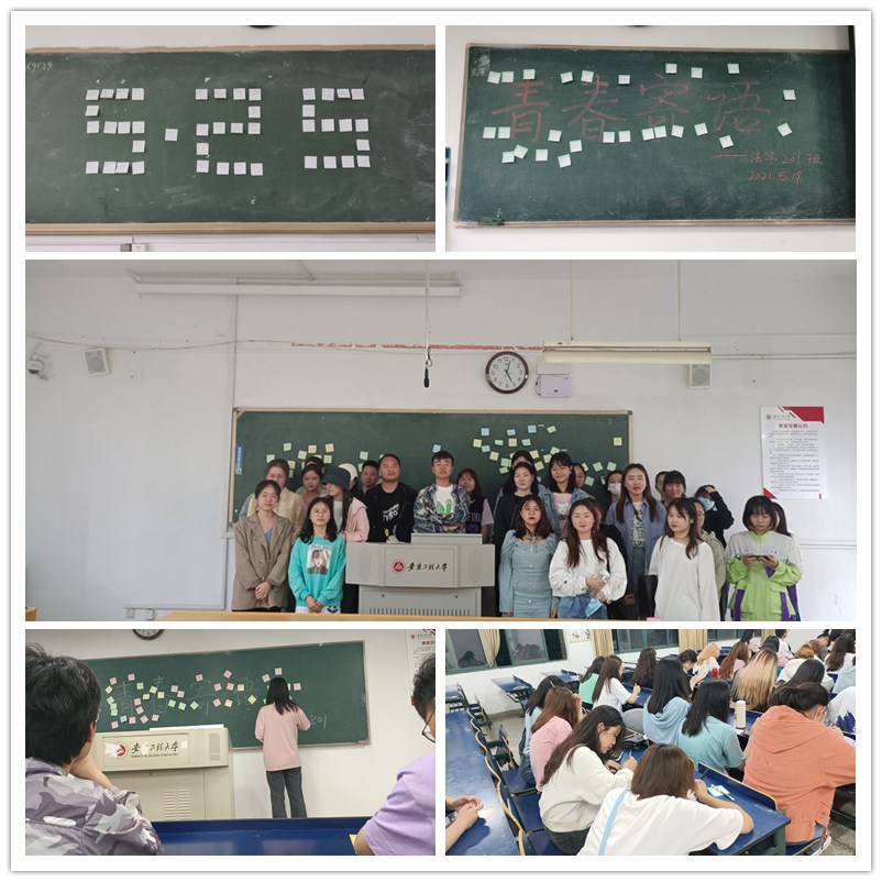 法学201班积极响应学院心理健康周活动,在班级开展主题为“青春寄语”心理活动,通过观看五四微电影《满襟热血,仍是少年》,同学们深深地感受到革命前辈们的爱国精神,拼搏精神。同学们根据微电影观后感写下自己的祝福,将写下心声和寄语的卡片挂在教室讲台前的黑板上,形成了“5·25”标识和一个挂满卡片的“祝福墙”,载满了对党、国家和朋友的憧憬和期待。
