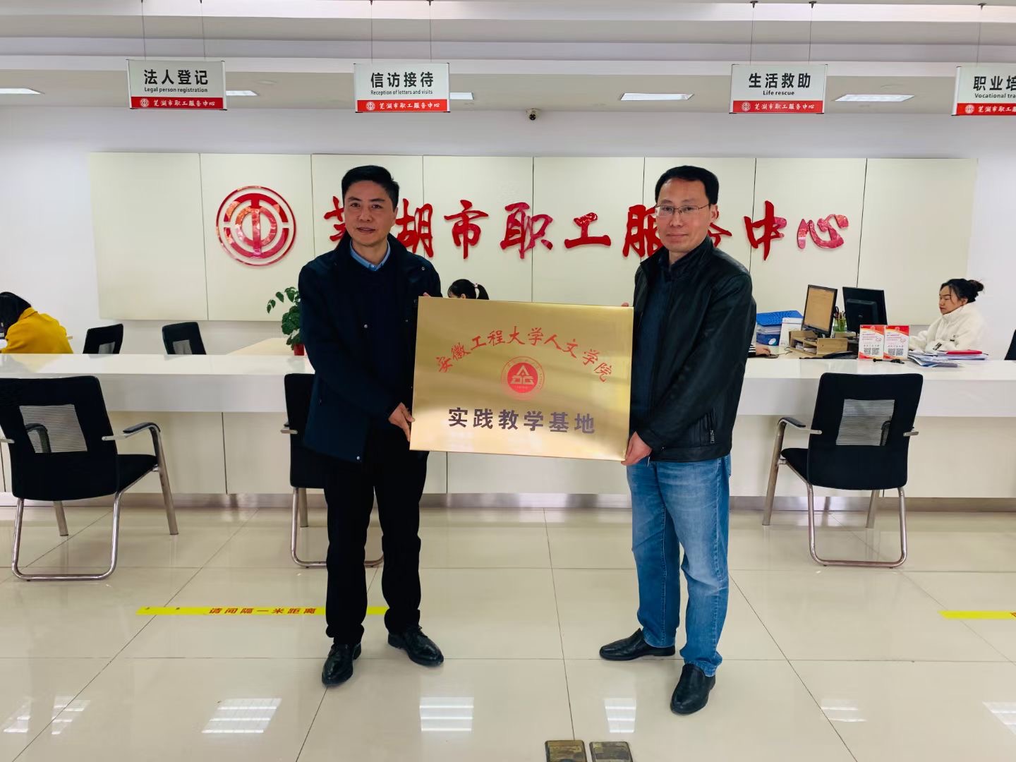 为进一步加强专业实践教学,深化校企、校地合作,探索校企、校地协同育人的人才培养模式,强化专业人才培养与社会需求的对接, 11月30日,人文学院与芜湖市职工服务中心共建实践教学基地签约暨揭牌仪式在芜湖市职工服务中心举行。