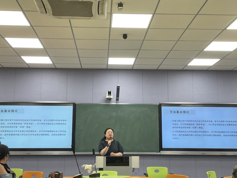 社会工作系主任周纯介绍了社会工作专业的发展历史、师资力量和学科建设情况,对社会工作“一生一策”的专业培养方案进行了深度解读,她鼓励同学们扎实学习,提高专业素质,努力成为社工高质量人才,为推动社会建设作出贡献。社工专业教师蒋艳就怎么进行专业学习和怎么通过专业学习变得更加优秀提出几点建议。随后社工专业新入职的博士高夏丽和张欣晨跟同学们进行了交流。