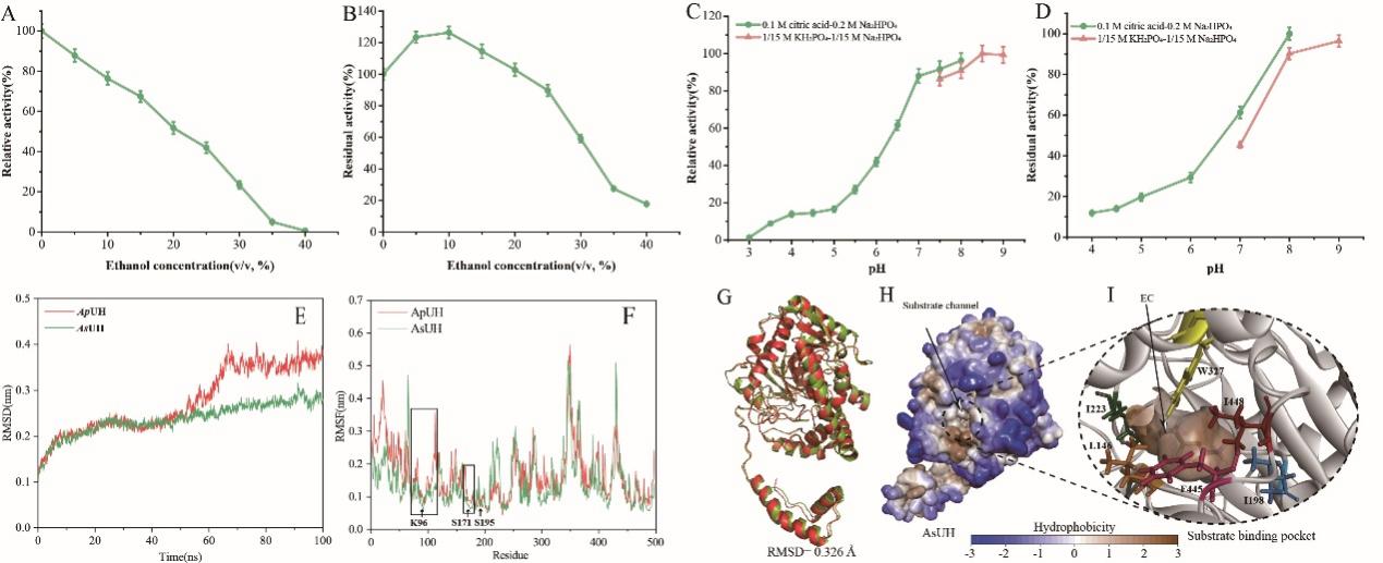 该研究围绕目前酶法降解酒精饮料中致癌物EC时所存在的酶在含有乙醇及酸性条件下活性低、稳定性差的难题,基于从极端微生物基因组数据库中直接挖掘EC水解酶的策略,利用系统进化树分析,结合基于深度学习工具的动力学参数预测及应用大肠杆菌异源表达系统进行实验验证,成功从Acidisoma silvae中鉴定出一种具有高乙醇耐受性及广泛pH活性的EC水解酶(AsUH),并在揭示其高乙醇耐受性潜在机制的同时进行了应用研究。